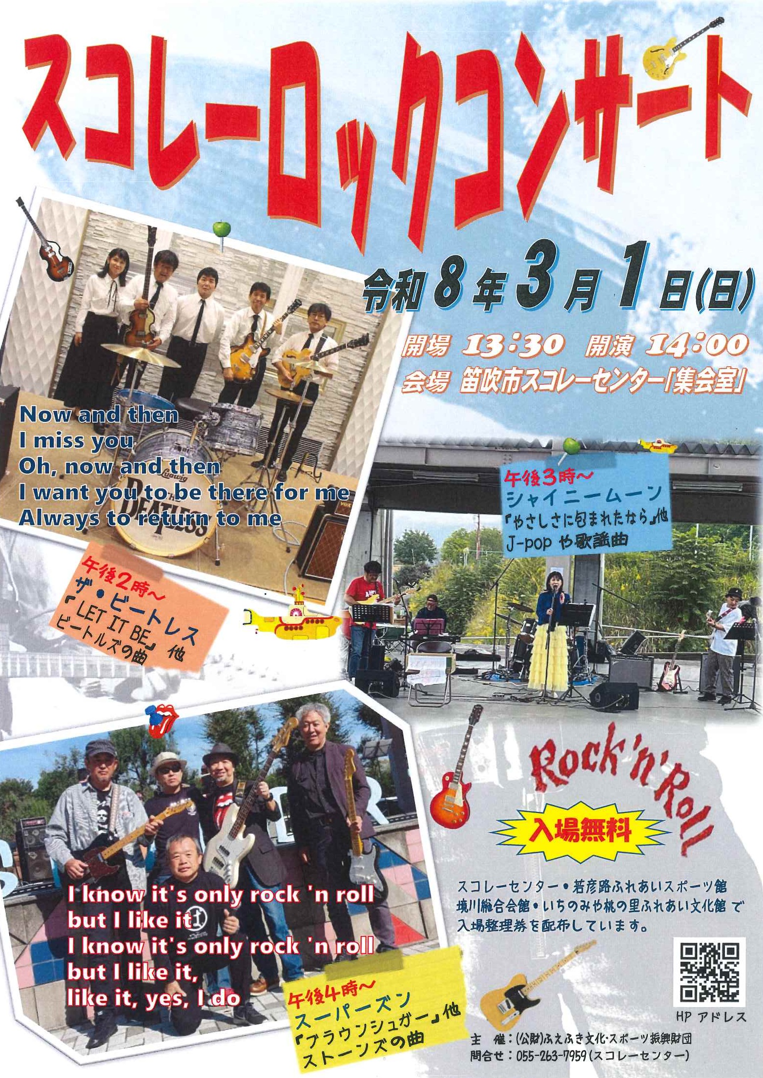 「スコレーロックコンサート」を3月1日(日)14:00から笛吹市スコレーセンターで開催します。開場は開演30分前の13:30を予定しています。