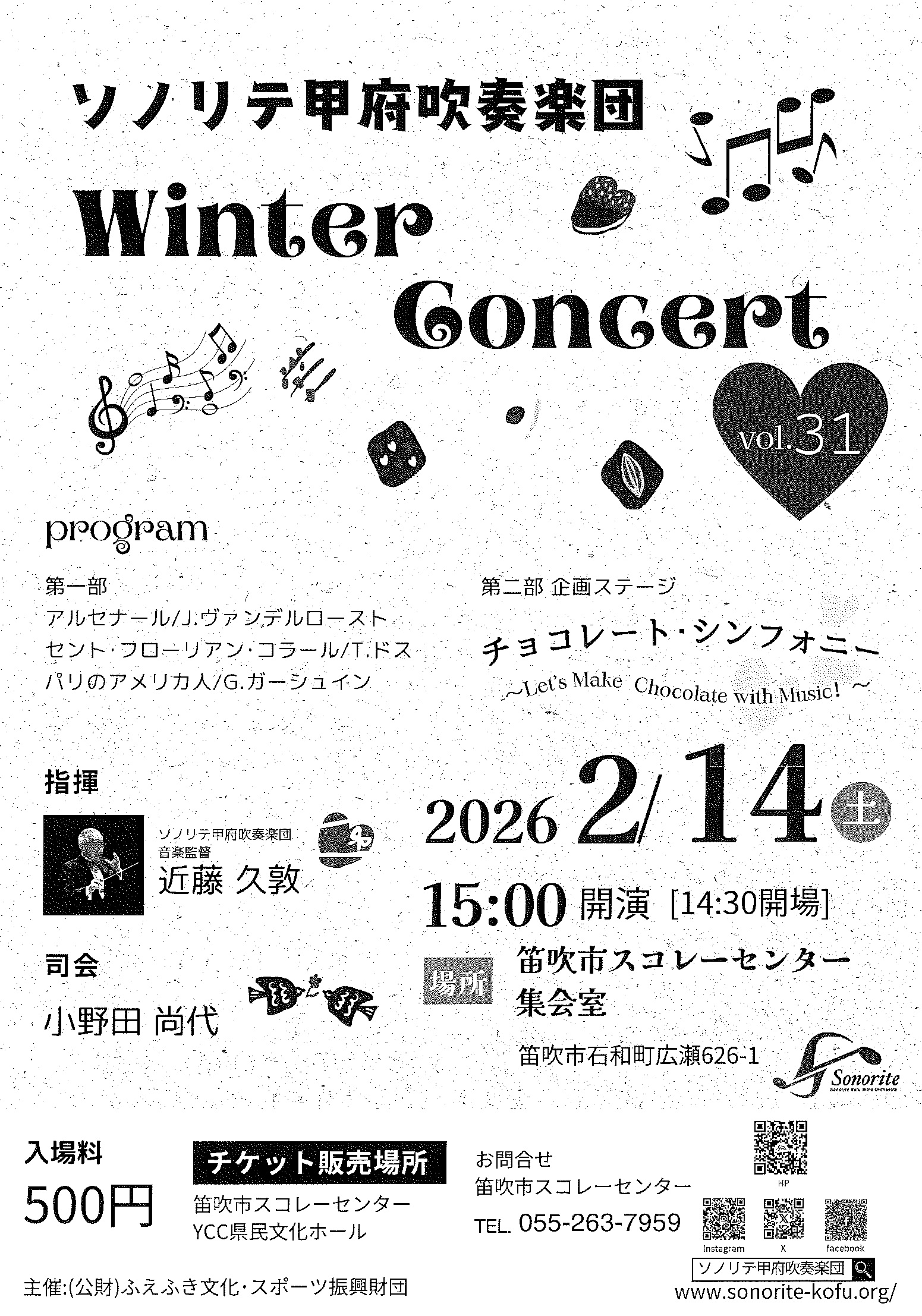 「ソノリテ甲府吹奏楽団 第31回ウィンターコンサート」を2月14日(土)15:00から開催します。開場は開演時刻の30分前14:30を予定しております。