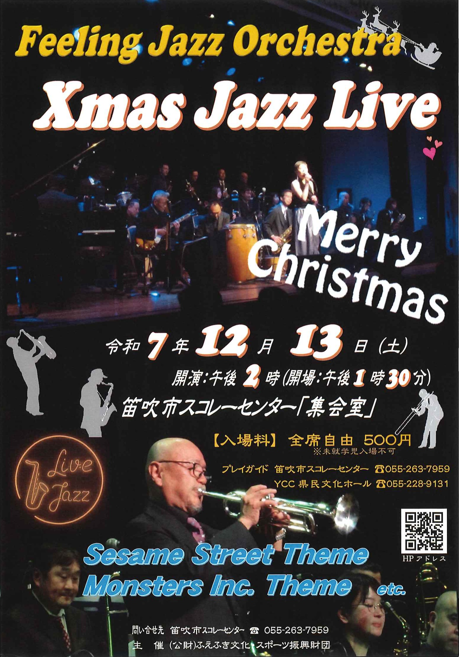 「Feeling Jazz Orchestra Xmas Jazz Live」を12月13日(土)14:00から笛吹市スコレーセンターで開催します。開場は開演時刻30分前の13:30を予定しております。