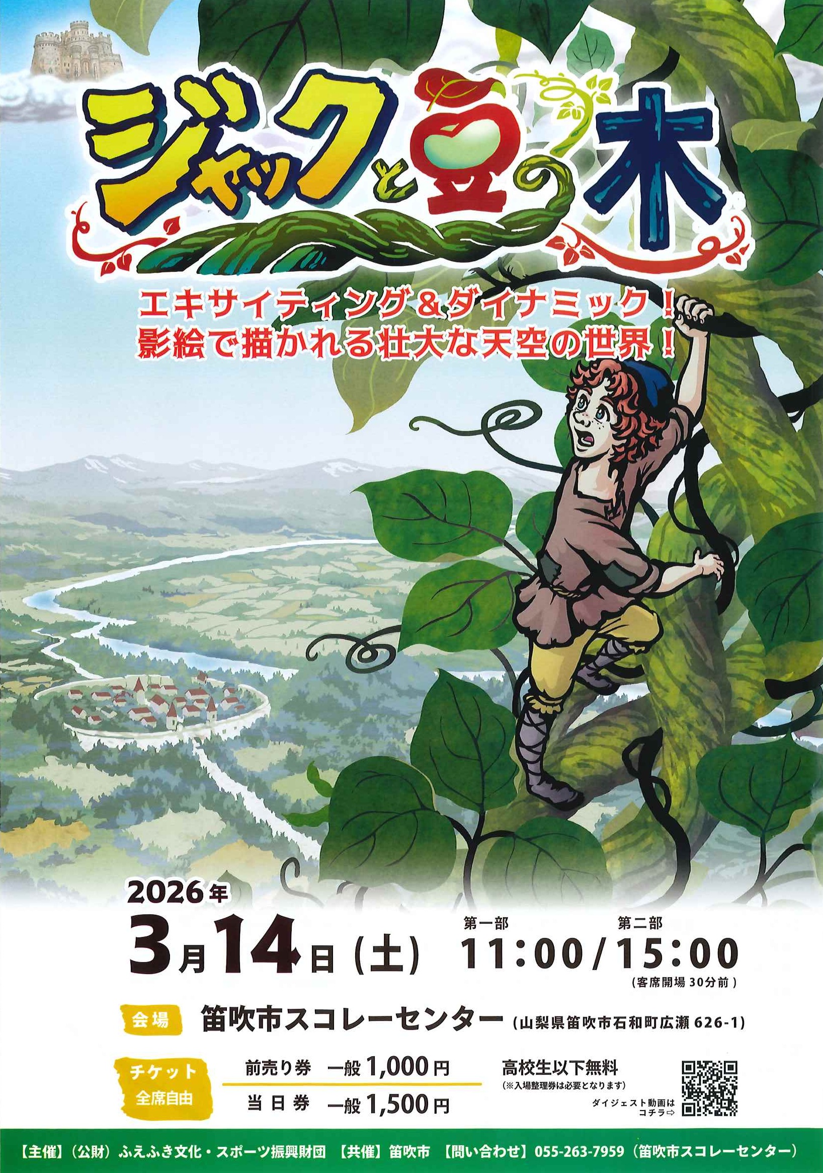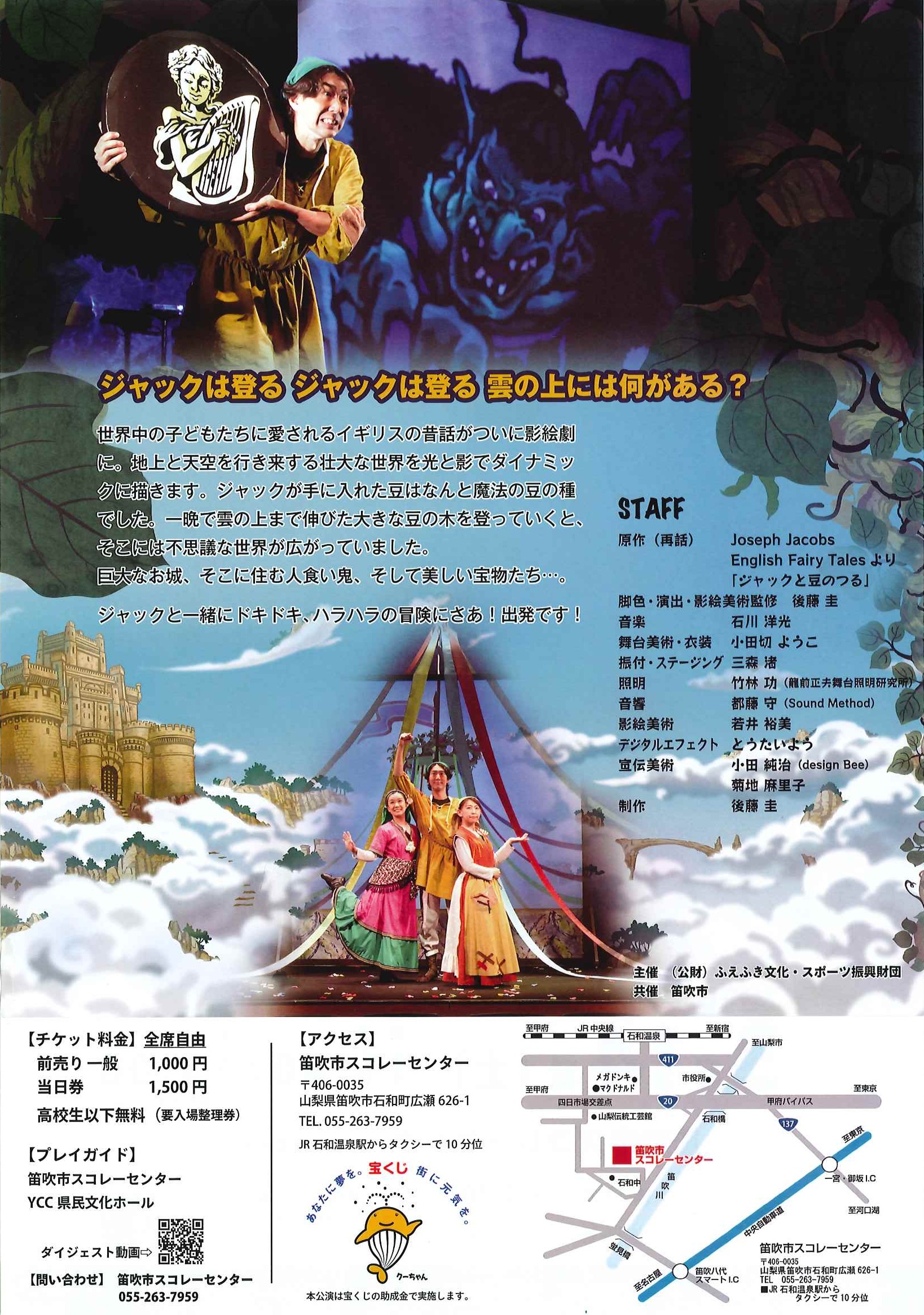 「影絵『ジャックと豆の木』」を3月14日(土)笛吹市スコレーセンターで開催します。「11:00開演の第一部」と「15:00開演の第二部」の2回公演となります。開場はいずれも開演時刻30分前の予定です。