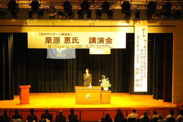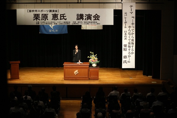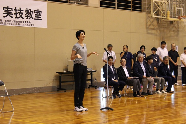令和7年度スポーツ講演会「栗原恵 講演会-やってから後悔するか、やらなくて後悔するか-」を10月5日(日)10:00から笛吹市スコレーセンターにて開催しました。 また、同日13:30から若彦路ふれあいスポーツ館アリーナにて市内スポーツ少年団・中学生を対象に実技教室も実施いたしました。